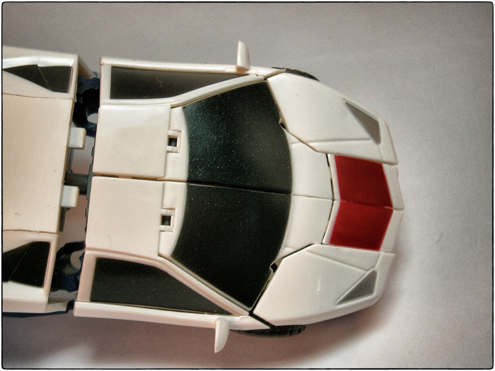 The car mode is sporty, and reminiscent of the Lamborghini Countach that the G1 character changed into (quite a few G1 Transformers were Lamborghinis as well).